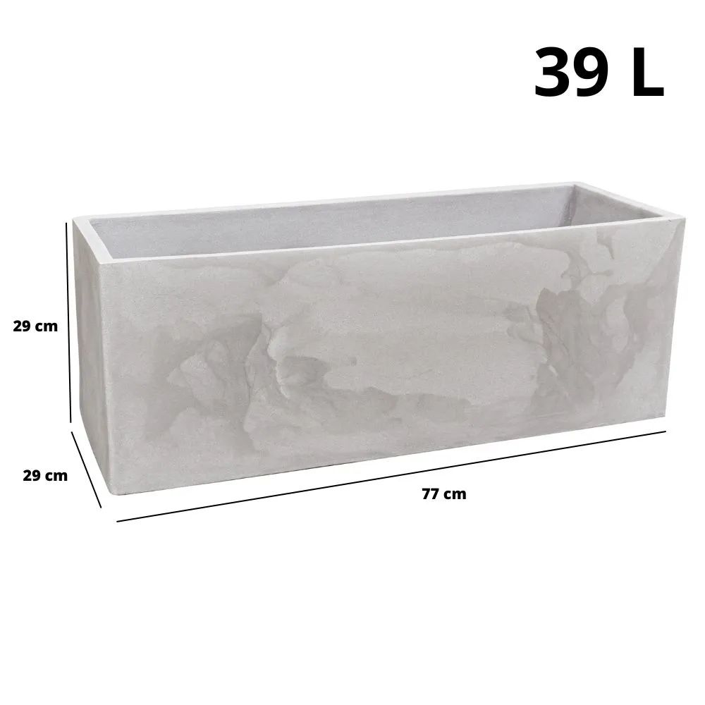 As Floreiras Flat na cor cimento queimado (cinza claro), têm como principal característica o seu formato de cantos retos, simples com muita elegância