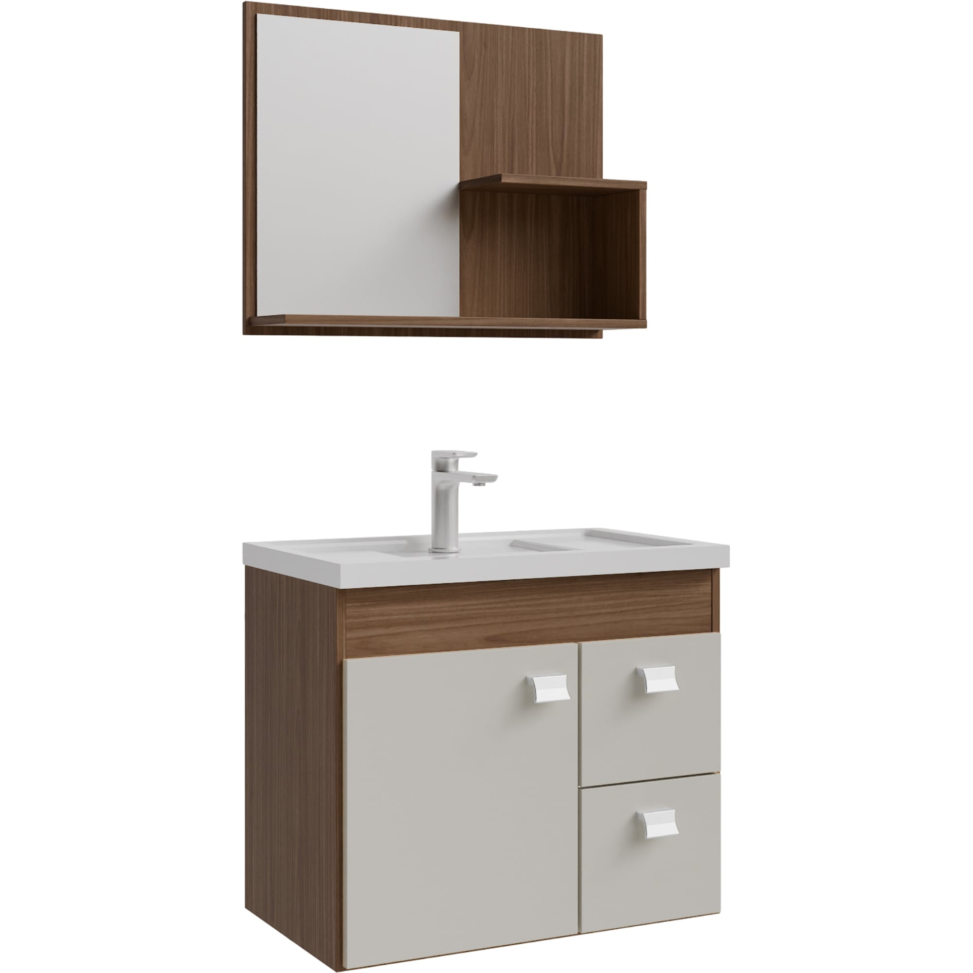 Com design compacto e funcional, o Kit Hortência da MGM é ideal para quem busca aproveitar bem o espaço no banheiro sem abrir mão da beleza. O armário conta com porta com amplo espaço interno, prateleiras e duas gavetas com corrediças telescópicas, que garantem abertura suave e mais conforto no dia a dia.